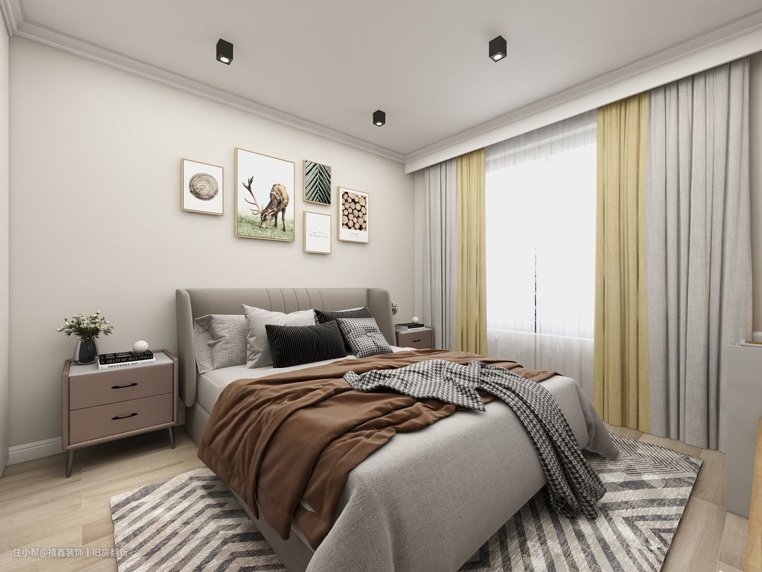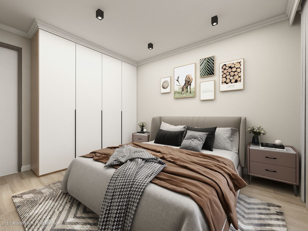 【卧室】主卧为了营造出更加温馨的氛围,于是取消主灯模式,用嵌灯对于整屋进行照明。多个嵌灯的优势在于不会让光线过于集中在一点,让每个角落都能均匀的受到光照。软装之前的卧室只是大白墙,整体感偏冷,所以在这个基础上,选择了奶油白去代替之前的大白墙,墙壁上增加一些温馨的挂画元素,让卧室更加的舒适有格调。