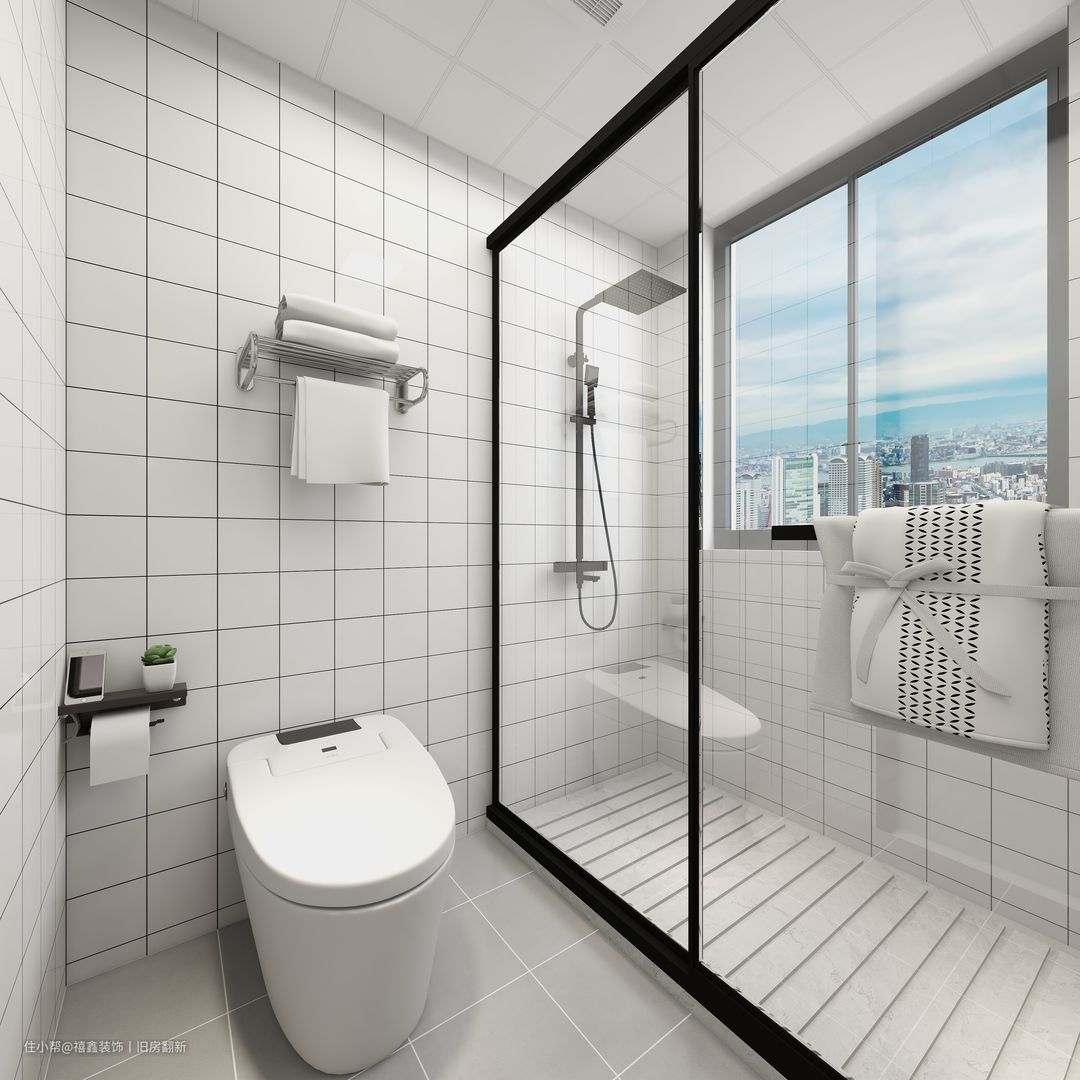 【卫生间】灰色大块格子瓷砖搭配白色黑色美缝小格子,拼凑出一个干净又通透的卫生间环境。灰色瓷砖从颜色上也更有立体感,淋浴区域的地面做防滑设计。充分考虑到淋浴中与道德问题。