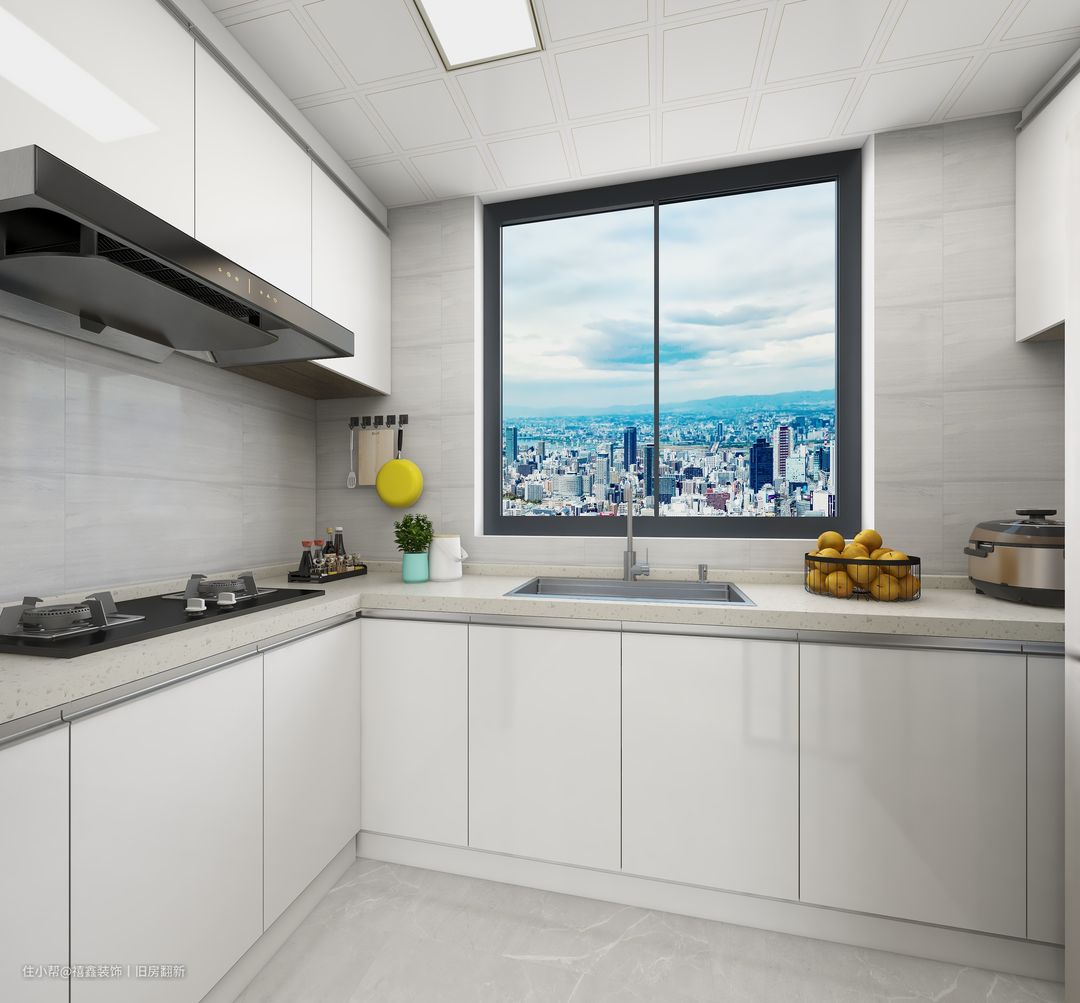 【厨房】厨房装修的颜色近看简单单一,纯白色的效果非常的大气高级。所有橱柜都采用无把手的形式,整体表面光滑又整洁。橱柜的柜门与操作台之间要留有缝隙,方便开关柜子。