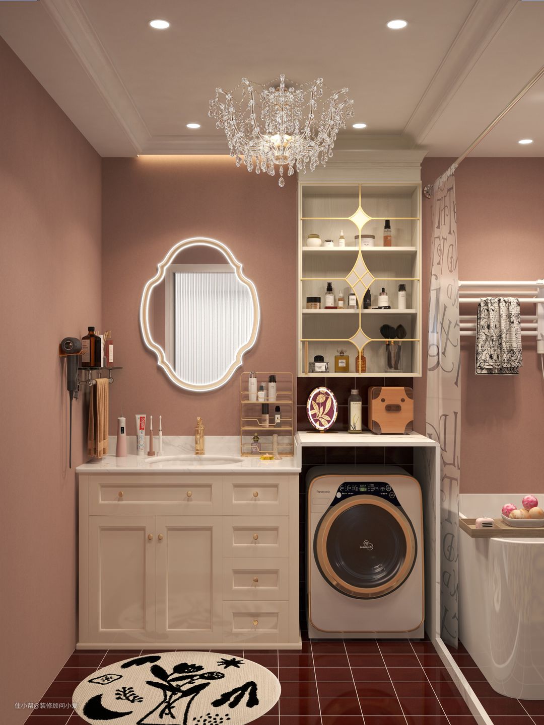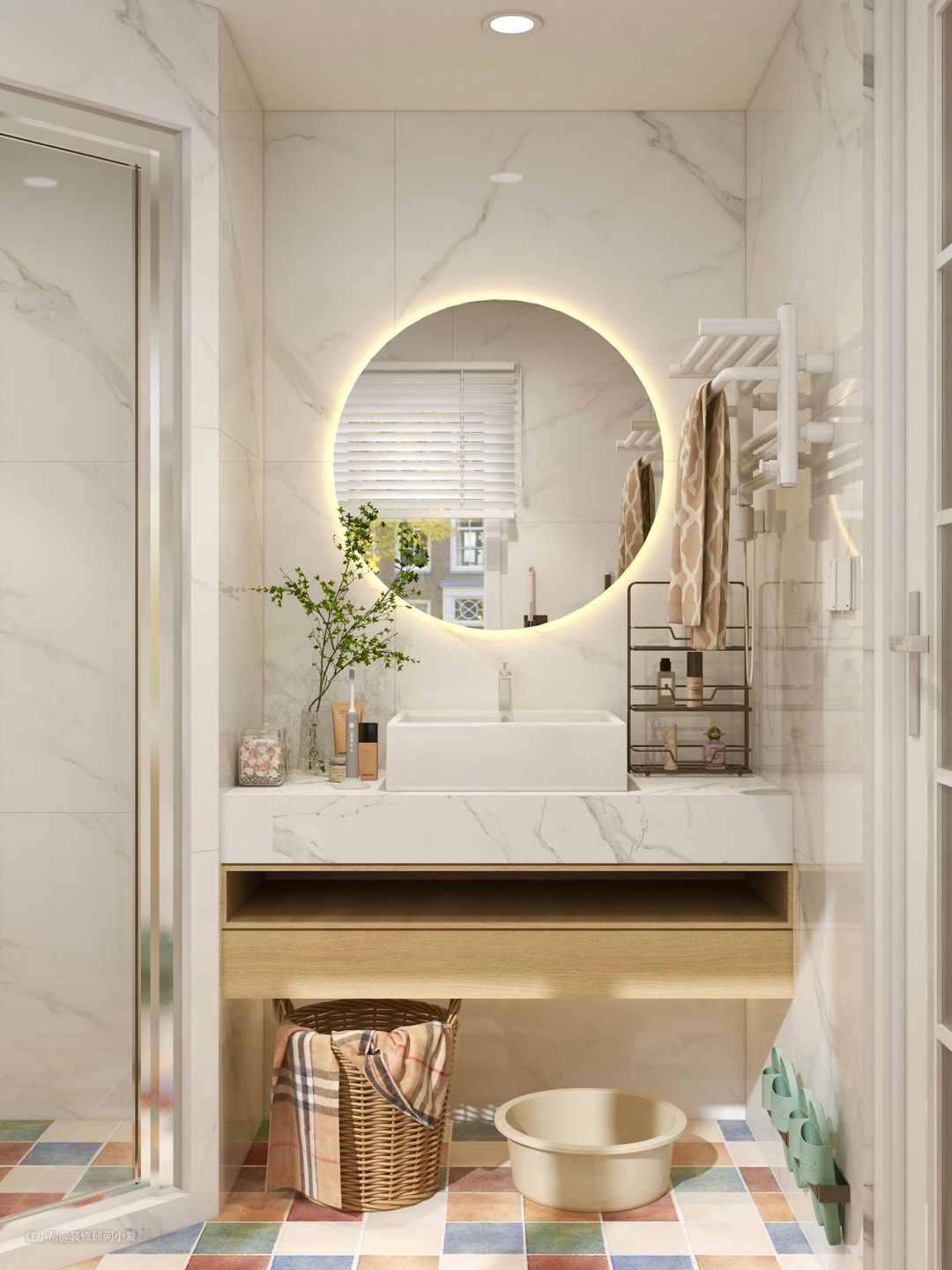顾名思义,连体浴室柜是根据环境定制而成,跟周围家具相关联,或是收纳柜,或是浴缸,也可能是洗衣机柜台。
