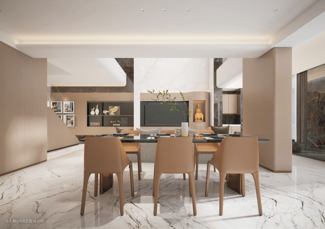 除此之外,餐厅侧面区域靠背景墙做顶墙酒柜,用以增加餐厅的收纳区域和装饰品展示区,同时也为整体空间增添了更多的实用性!