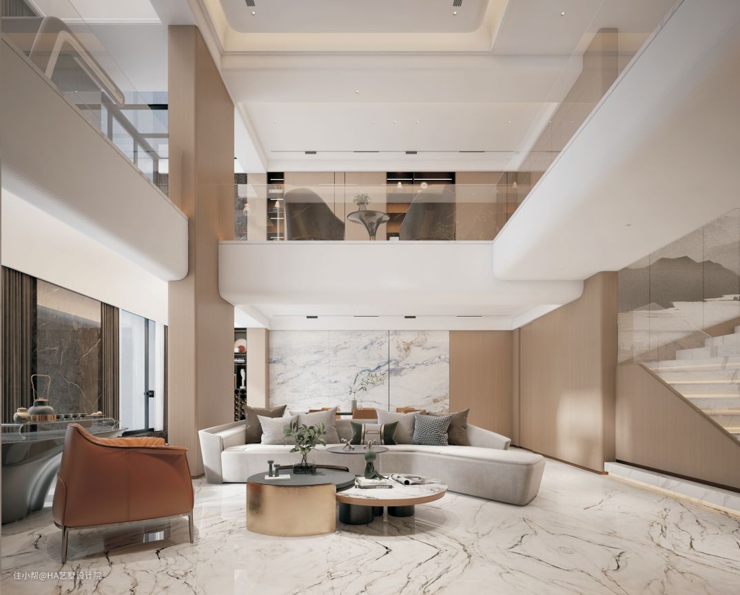 同时将地面区域分成了两个不同的空间,通过透明的玻璃围栏形成了大体的风格,也不妨碍室内采光和视觉效果上的统一性,给人从第一眼上就营造出一种钟灵毓秀的大宅气息。