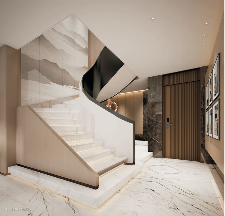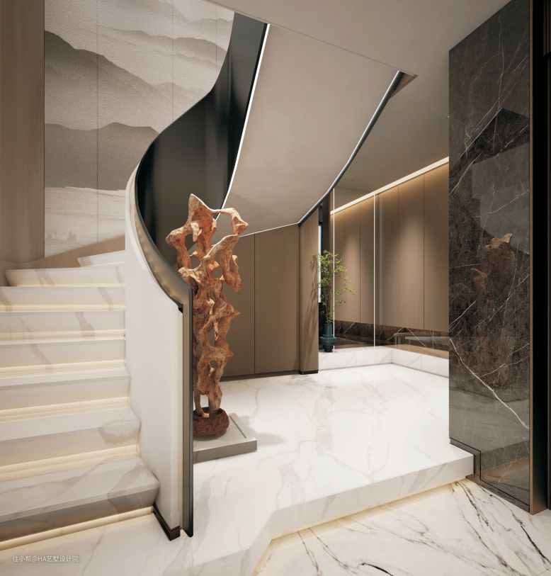 设计材料:大理石岩板、原木色地板、钢结构、实木踏板侧板、金属线条