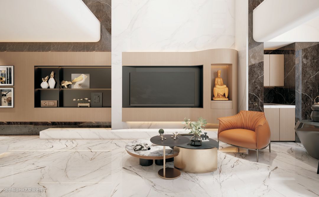 构成了四面围合的聊天区域,背景墙方面选用了空灵的山水图大理石岩层,既彰显了现代气息,又具有古典特色。