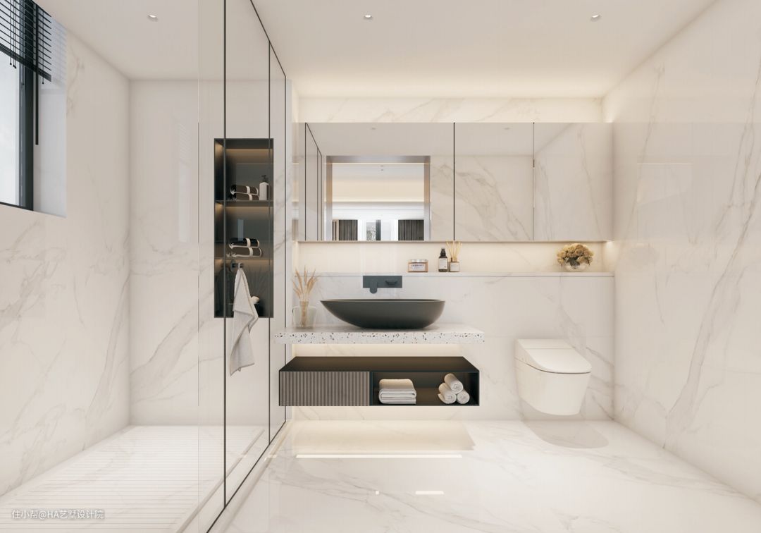 卫生间的设计秉承了一种“无一物落地”的消除卫生死角的设计,通过将主卫的整体区域统一划分为淋浴区与洗手区两部分,做到干湿分离。