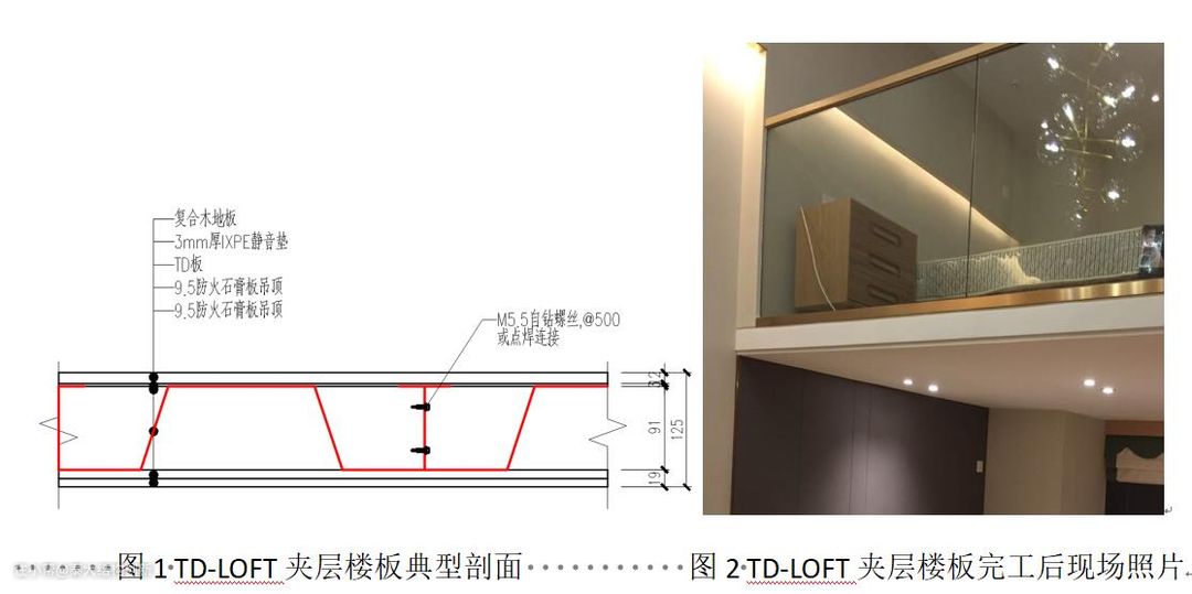 TD-LOFT夹层采用一块压型钢板直接跨过整个开间,并利用压型钢板作为上面木地板的龙骨,且同时作为下面石膏板吊顶的龙骨。不同项目也可以采用不同的构造做法,充分代替传统木板作为墙面板或者是楼板的一种新型板材。