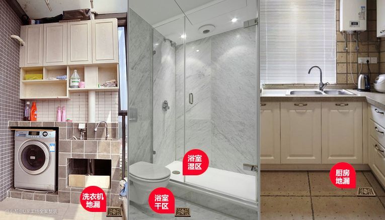 卫生间区域通常涉及到两个地漏,淋浴区和日常清洁区各一个。