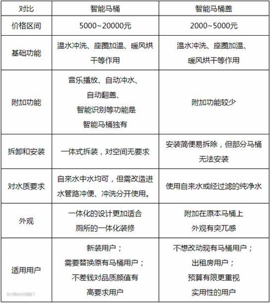 而智能马桶盖在安装方面比较简易方便,同时又易拆卸,可以轻松移动;在价格上有明显的优势,性价比较高;但是智能马桶盖并不适用于所有的马桶,且它对于水箱到前端的距离等等都有限制。