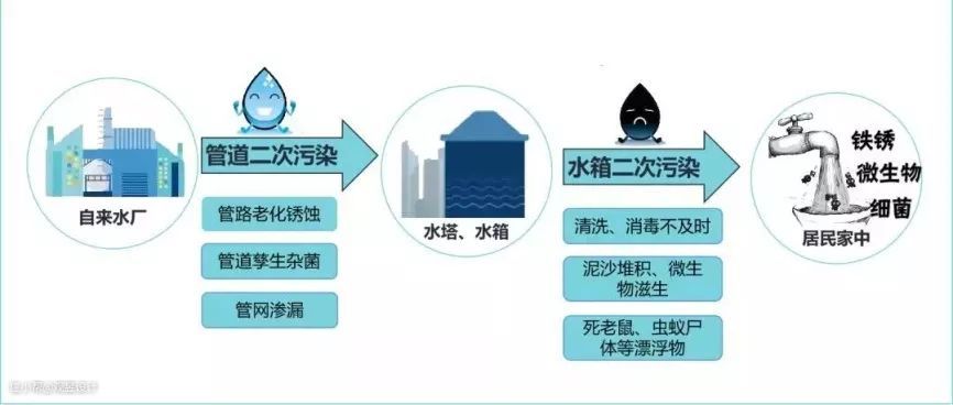 二次供水设备污染:市政服务的水压是不能满足高层建筑用水的,那么水进入住户家中需要二次加压,通常小区会在楼顶设置蓄水池或者水箱,二次加压后自来水才会流入户主家中。