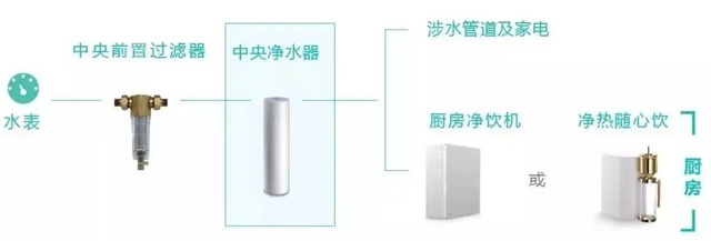 Ps: 中央净水器和软水机两者主要解决洗澡、洗涤等生活用水,并达不到直饮标准,若想达到直饮水的效果,还需一道设备——末端净水器。