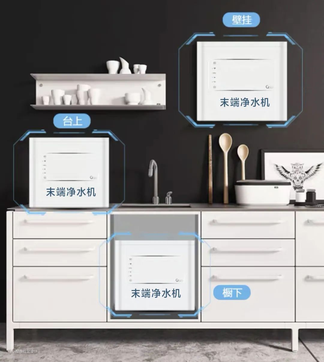 一般末端净水机安装在厨房的出水龙头之前,例如水槽柜、台面、壁挂,一般搭配管线机使用。