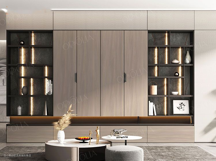 如果客厅相对宽敞,可以把整面墙都利用起来。不仅能提供超大容量收纳,美观大气的外形还能提升客厅格调。