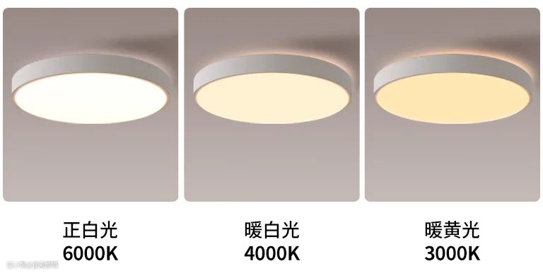 三种光色可以通过开关随意切换,正白光6000k,明亮清新;暖白光4000k,舒适自然;暖黄光3000k,柔和温馨。多种功率、不同色温给房间不同的使用场景提供了更多选择。