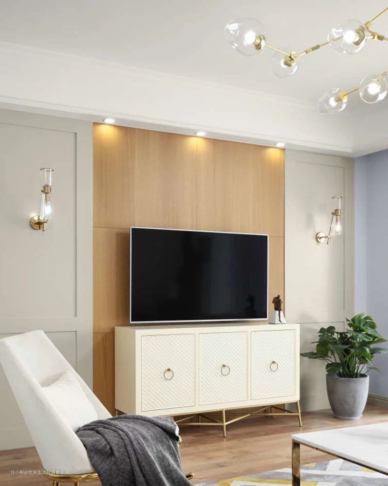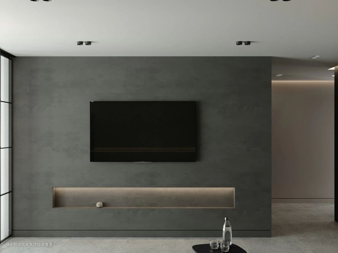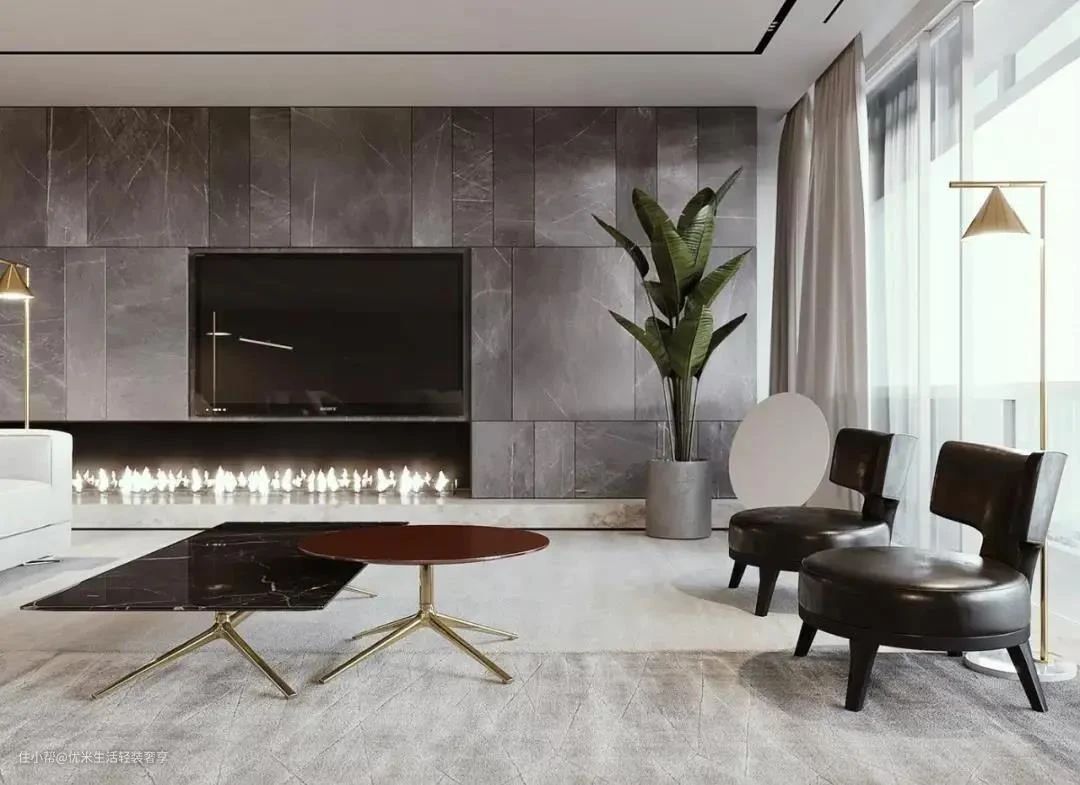 有些朋友在设计电视墙的时候会选择做整墙造型,比如用石材或木质,这时候就可以直接将电视嵌入背景墙造型中,既能减少壁挂电视的突兀感,又能让整体看起来优雅大气,有格调。