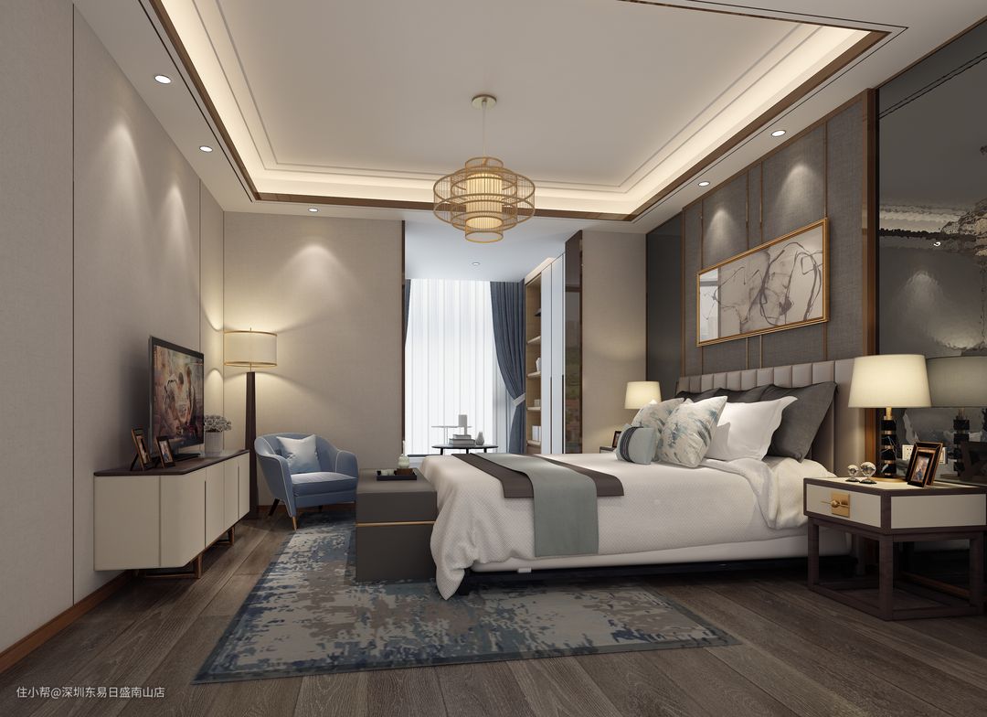 充满隐私的居室设计,床头背景墙以一幅巨大的水墨画为设计亮点,与水墨画同色调的高级灰白床褥,仿佛在静谧的山谷中悠躺。别致的金饰吊灯,电视旁的绿植摆放,在沉稳的居室格调中增添一丝柔情。