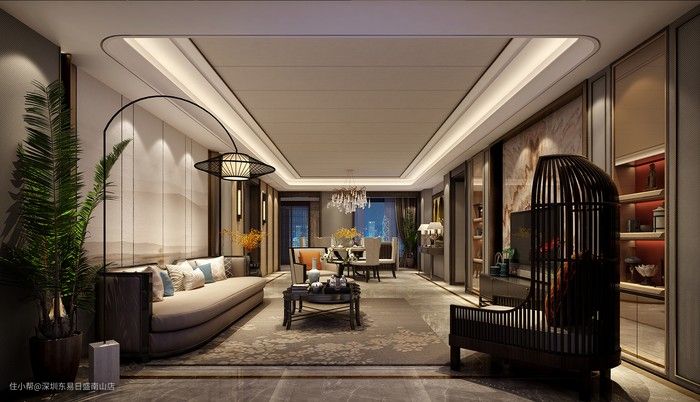 从客厅可以看出,这是一个现代轻奢+中式的设计风格,客餐厅开放式格局,空间通透宽敞,选用高级灰的主调设计,大处显芳华,细节显严谨。鸟笼般的单人沙发,与别致的落地灯一致,充满对称感。水墨画的护墙板沙发背景墙,两侧为收纳柜的大理石电视背景墙,满足收纳需求。客厅无主灯设计,更显通透。