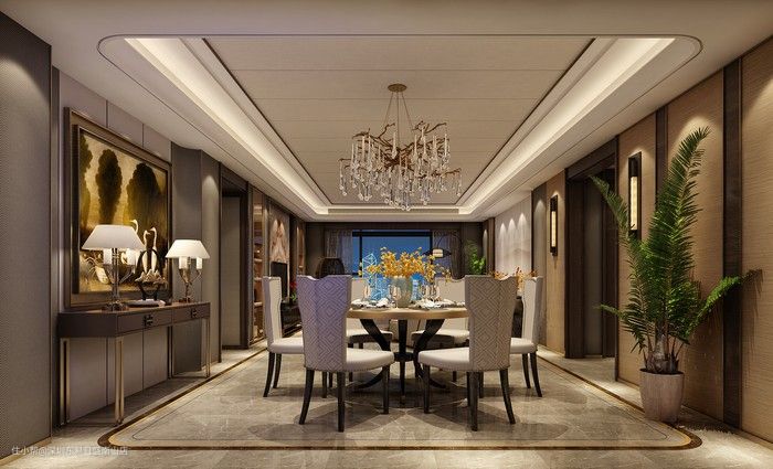 餐厅与客厅通铺大理石瓷砖,别致的水晶吊灯,尽显轻奢品质格调。餐边柜的两盏台灯,充满低奢、内敛的空间元素,绿植在一旁点缀,与客厅同侧的绿植也显对称之美。