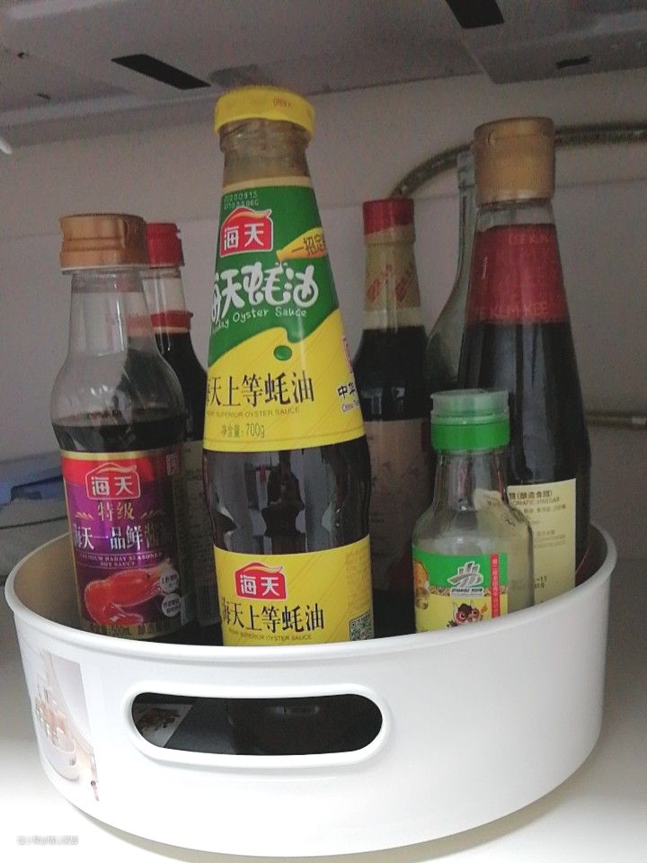 如果家里做的是普通单层吊柜,还想收纳酱油醋瓶的话,可以选择旋转收纳盘,它可以360°旋转,即便放在高处的吊柜里,拿取里面的也很方便,转一下即可。