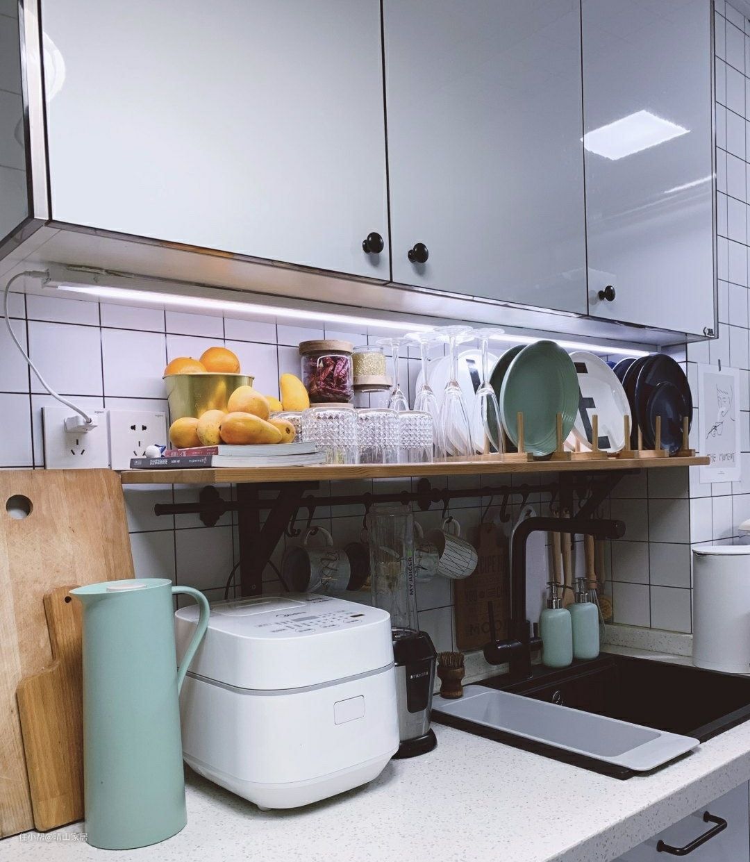 将单层的改为双层的,上层柜子里收纳低频厨房用品,下层放置调料盒、水杯之类的中高频厨房用品,拿取方便,也不用额外再做置物架了。