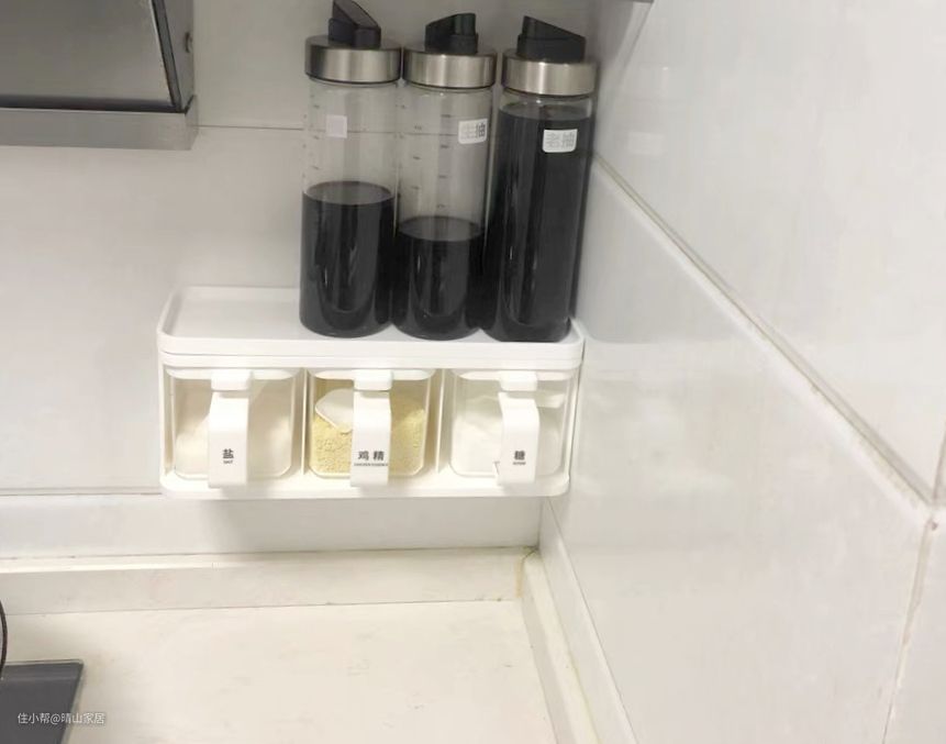 对于厨房已经安装定型,且空间有限,没有合适的位置放调料的情况,可以选择让它们统一上墙。