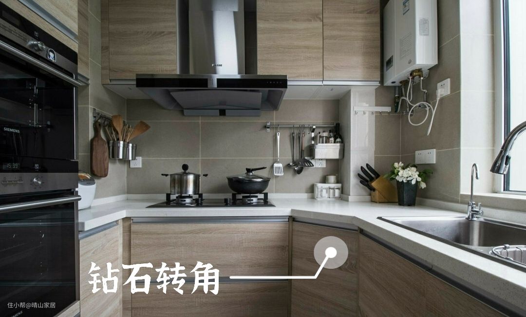 定制厨房台面时,拐角处的常规做法,都是直角形,但有烟道的位置,再这样做的话,就会导致剩下的台面很小,不好利用。