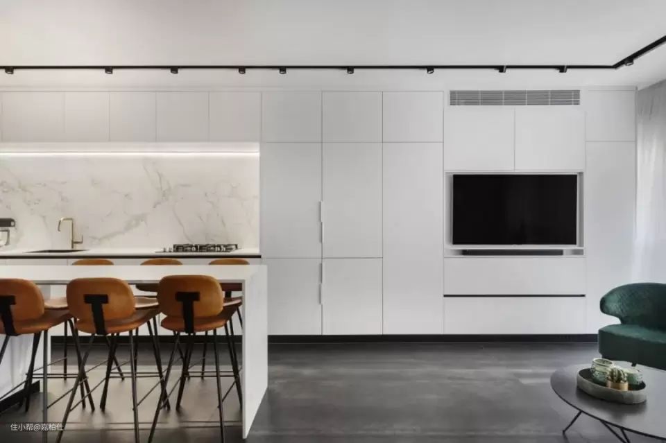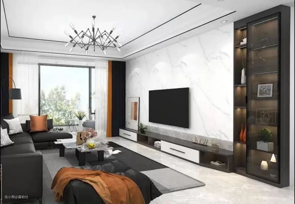 当然,你如果喜欢带有金属元素的轻奢风,也可以在白色基调的电视柜体上,用金属条勾勒出空间的奢华感。