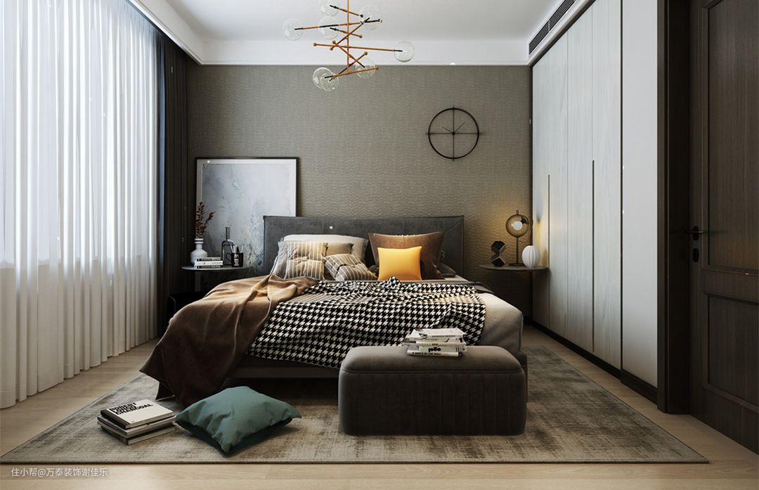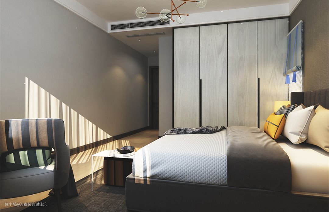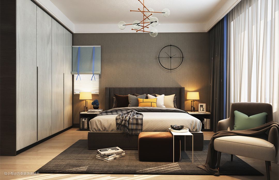 卧室色调配合整体冷静 理性得高灰度配色,客户在全屋风格和配色上不会有太大得跨度得感受,温和统一。