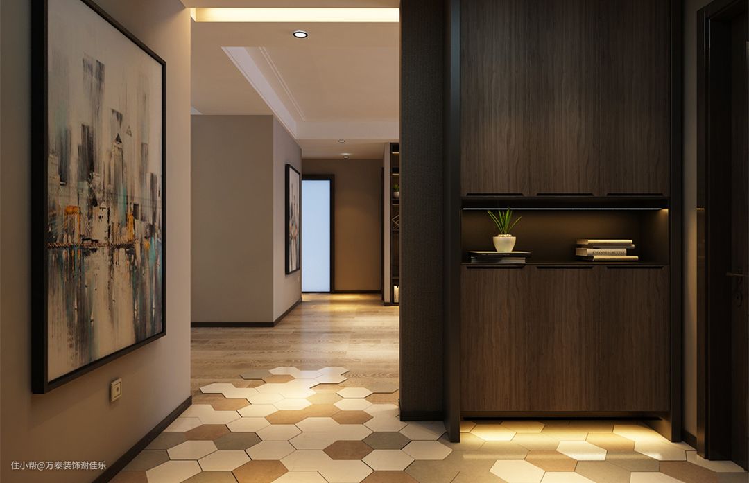 玄关相对紧凑,风水上有比较好得聚气得说法,地面拼贴六角砖向客厅延申,门口换鞋得区域相对木地板材质也更好打理,不显脏,除了鞋帽柜,也利用剩余墙面做黑板墙,提供一个随手书写提示/改善家庭互动得区域。