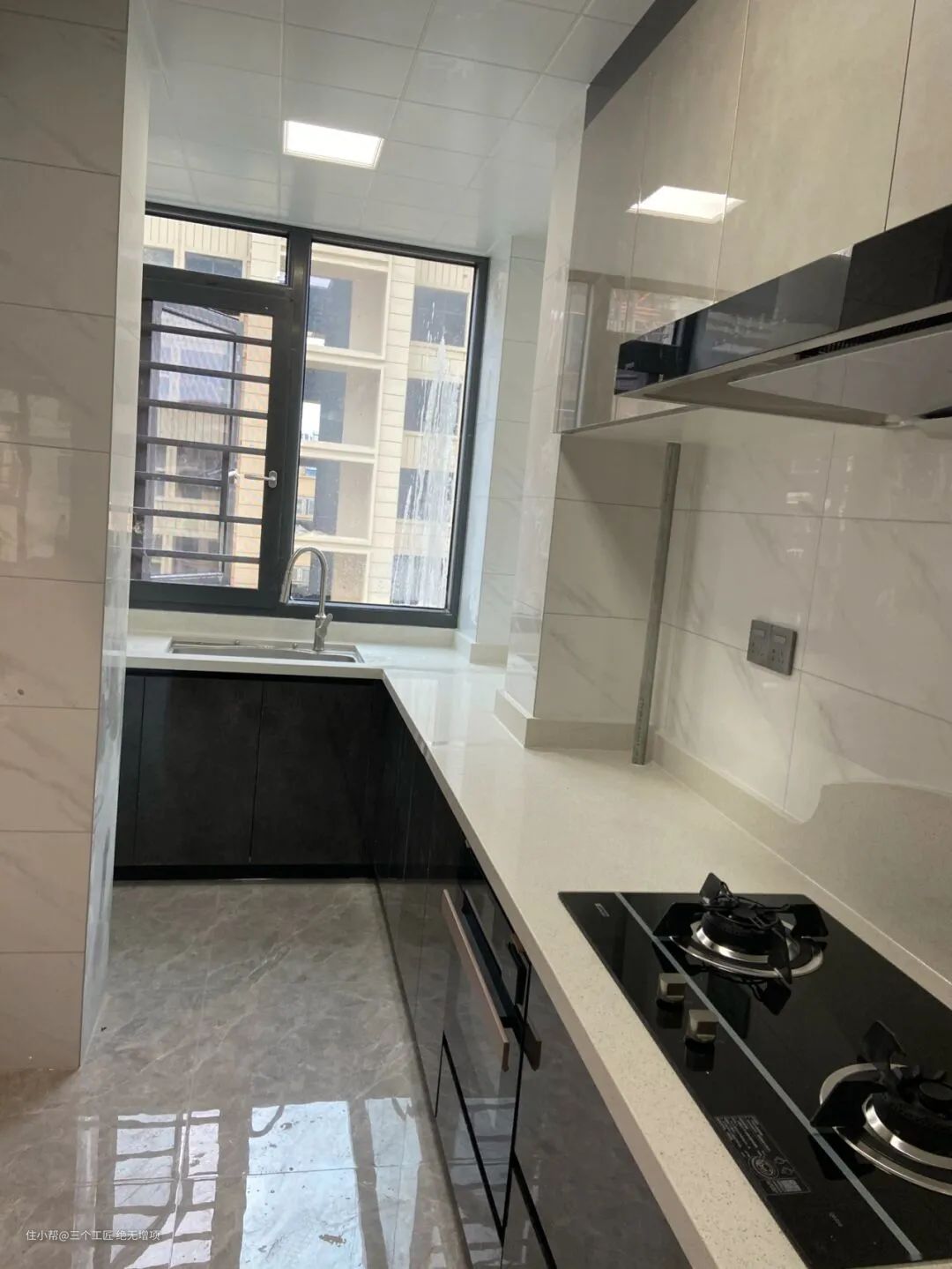 厨房在餐厅旁边,黑色橱柜根据结构定制。布局形成了“洗、切、炸”的顺序,使用起来非常方便。这种厨房布局操作方便,大小和位置都合适。以后入住的时候,可以在墙上安装一些置物架,方便存放一些常用的小东西,尽量保持房间整洁。虽然没有找装修公司,是我自己设计的,但是我可以考虑到这一点,假装有这样的效果,非常好,无可挑剔。