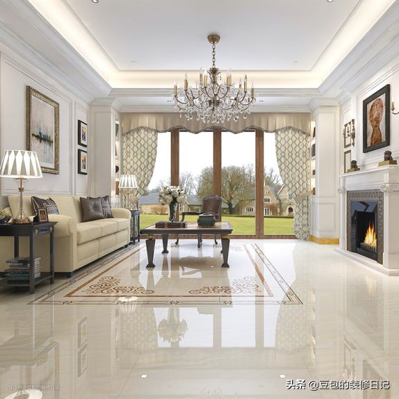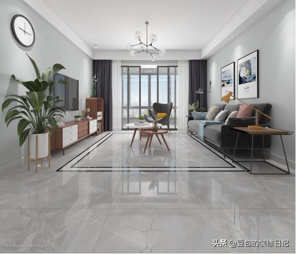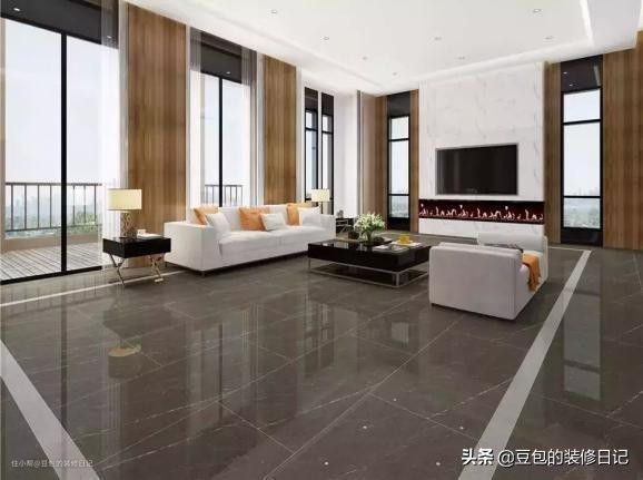 首先从客厅空间说起,客厅瓷砖选择可以选抛光砖,这种瓷砖硬度高比较耐磨,客厅是一家人经常活动的区域,所以瓷砖最好选耐磨结实度好一点的。而且这种瓷砖铺贴效果也是非常不错,选择800x800尺寸,不要做波导线,如果和阳台是互通的看可以选择通铺,这样效果会更好。