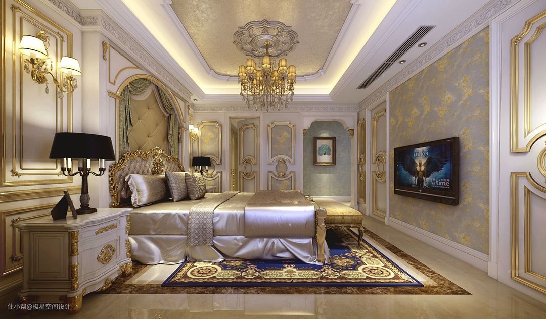 这款卧室墙壁上运用了大量的石膏线和石膏板做造型,棚面和之前两款的造型大同小异,只不过是在中间造型区域,刷了艺术漆,使得整个卧室从棚面到墙壁再到地面看起来非常的整体和统一。一般来说,休息室的地面多选用木质饰板,但是还有一个重要的配饰,那就是地毯。加上一张图像和色彩浓艳、脚感舒适、气质高雅的地毯,瞬间让空间变得赏心悦目。