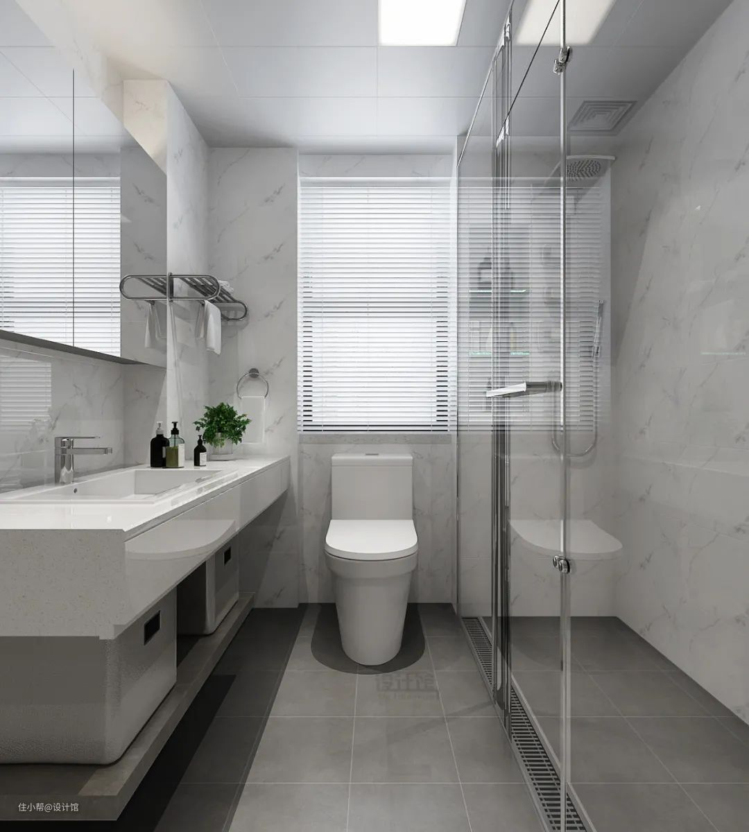 在户型比较方正的卫生间中,一般马桶、淋浴与洗手盆都是以三角分布的格局,这样就可以在中间位置装一个正方形的淋浴房。