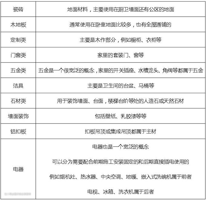 为了方便理解,先做一个形象的比喻。当你走进一间房子——你眼睛看不见的,例如隐藏起来的水管、插座背后布好的电线、吊顶里面隐藏的龙骨,这些都是基装;对应的这些看不见的水管、电线、龙骨就叫辅材;而安装完成后你无法移动的,例如铺贴好的瓷砖地板、安装好的马桶台盆、固定牢的橱柜衣柜,这些就叫主材。想象一下,你把这个房子颠倒过来,会掉下来的就是家具;当然,所有需要电才能使用的就是家电。