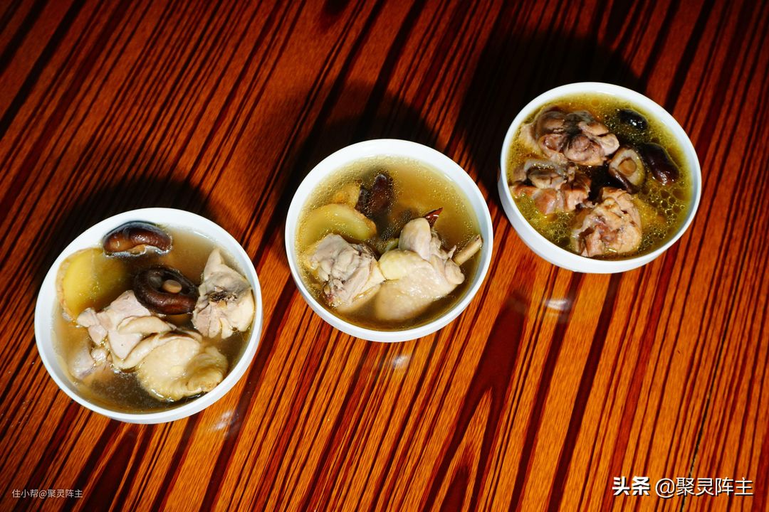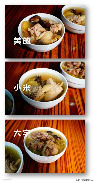 接下来盛出三碗鸡汤,这个对比简直是太明显了,大宇炖出来的鸡块基本上都快碎了,而另外两碗的鸡肉则保持在一个比较完整的水平。