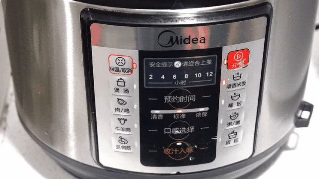 其次,电压力锅锅体上还有一个显示面板和一个操作面板,两者配合使得它的炖煮模式比起美的来说多了很多,而且每个模式还能自由调节炖煮的时间,自由度也更高了。