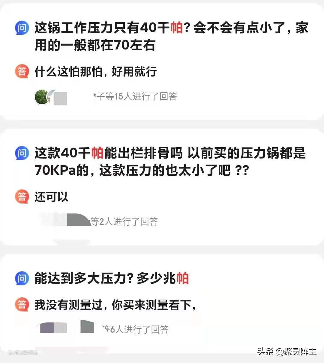 因此,压力锅的压力大小也是衡量压力锅性能的一个重要因素,一般来说,普通电压力锅的最大压力一般在50kPa左右,也就是比大气压(一个标准大气压约为100kPa)多一半左右。而我们常见的以电饭煲为主业的压力电饭煲,虽然也能炖汤,但是其他它们的压力就小很多,一般都是微压,只有20kPa左右。然而我们常见的明火高压锅,一般最大压力能到80kPa,这也就是我们老是觉得电压力锅炖出来的肉不如高压锅炖得香的原因。下图是网友对某电压力锅压力小于家用高压锅的疑问。