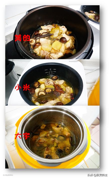 接下来我又炖了一个蘑菇鸡块汤,分别用的都是三台机器默认的煲汤模式。基本上我设置的三者都是四十分钟完成烹饪。对比三者锅中的汤汁剩余程度,可以看出三者密闭性都是相当不错的,所剩下的鸡汤基本上都还能没过鸡肉。
