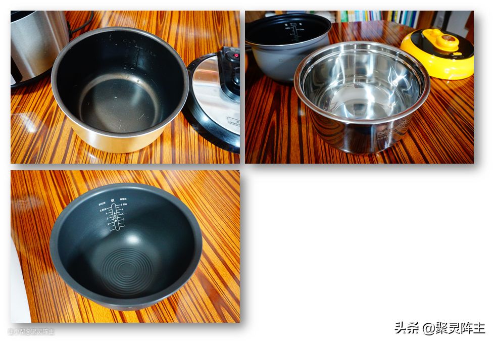 现在的电压力锅的内胆材质有很多,一般来说铝制内胆太low,虽然导热好,但是总感觉不太健康(毕竟现在吃油条大家都要挺小心的)。然后目前市面上常用的内胆材质就还剩下复合材料内胆、不锈钢内胆、铸铁内胆、陶瓷内胆等。以下是后面要评测的几款压力锅的内胆材质实拍。