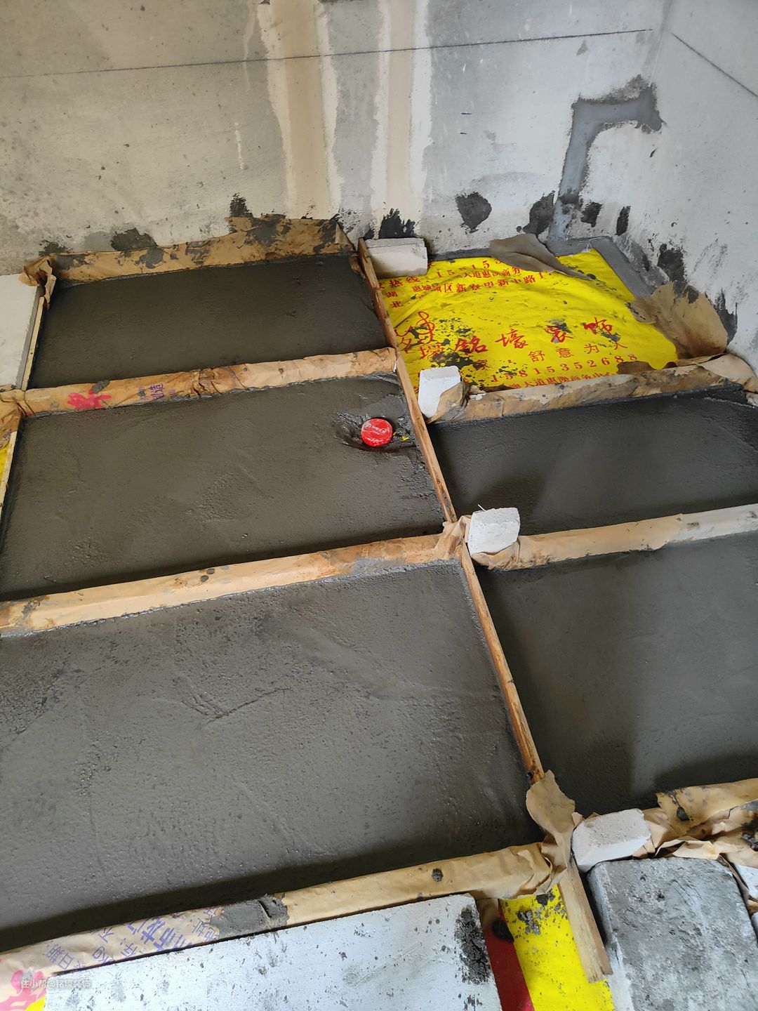 8、沉箱架空:以卫生间实际尺寸合理砌砖,一般是两边和中间砌3条小沙砖,两边高中间低,这样放好预制板后就会有坡度。