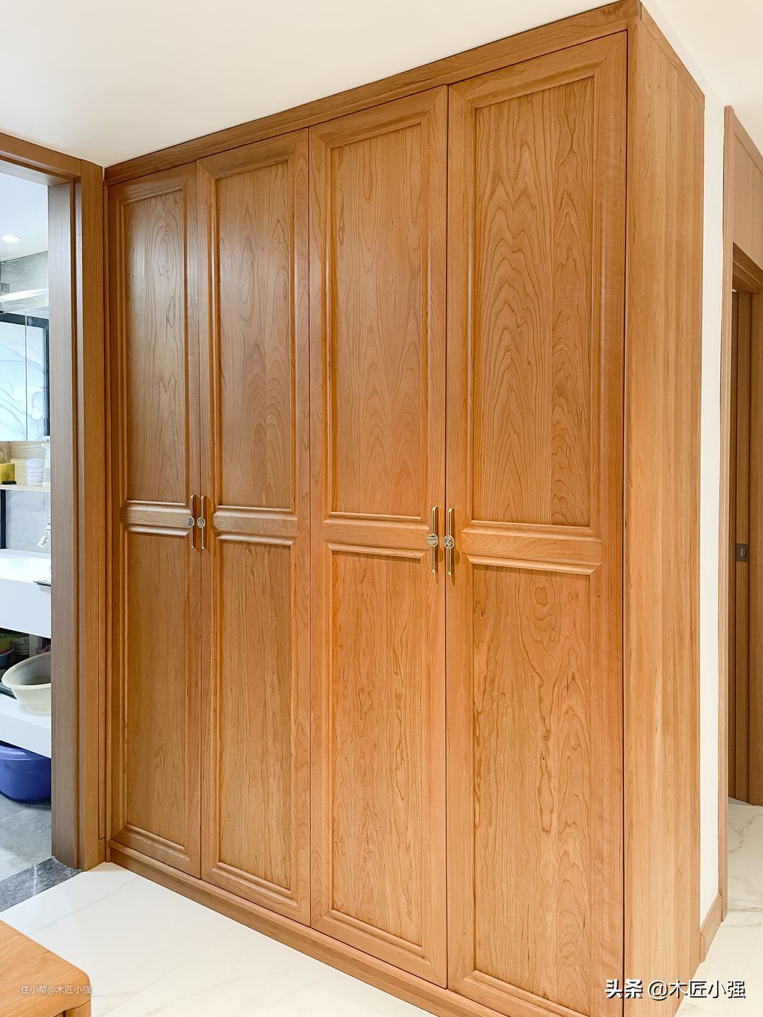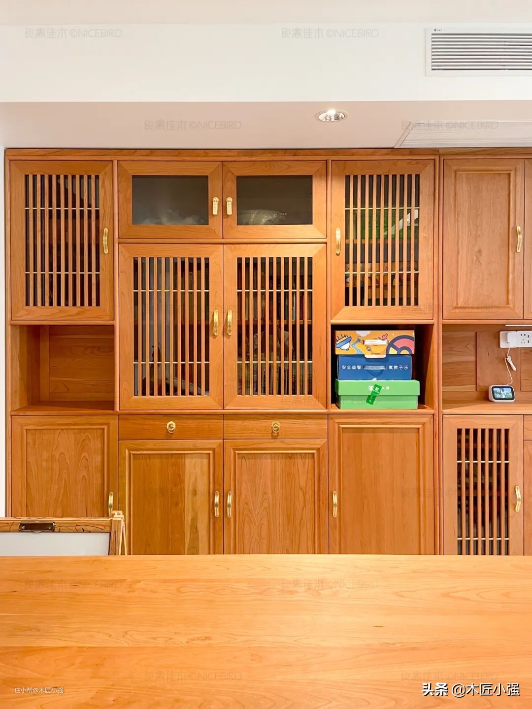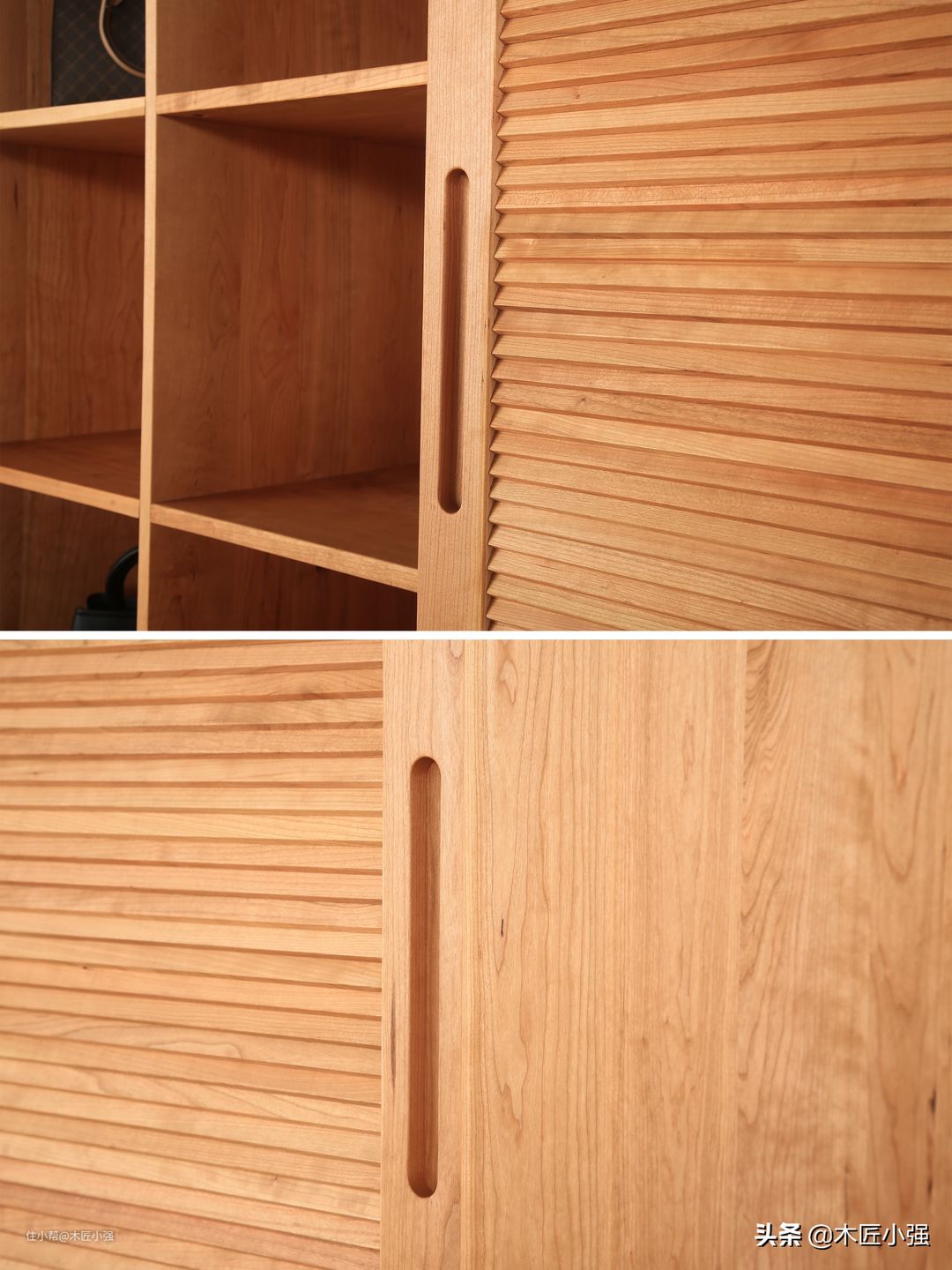 而对于衣柜这种柜门面积较大的,若是不喜欢有可能出现的色差问题,你可以格栅门的。格栅处理能很好地解决色差的问题,最起码会让色差不太明显,即便有也无伤大雅,给喜欢樱桃木的宝宝参考哒