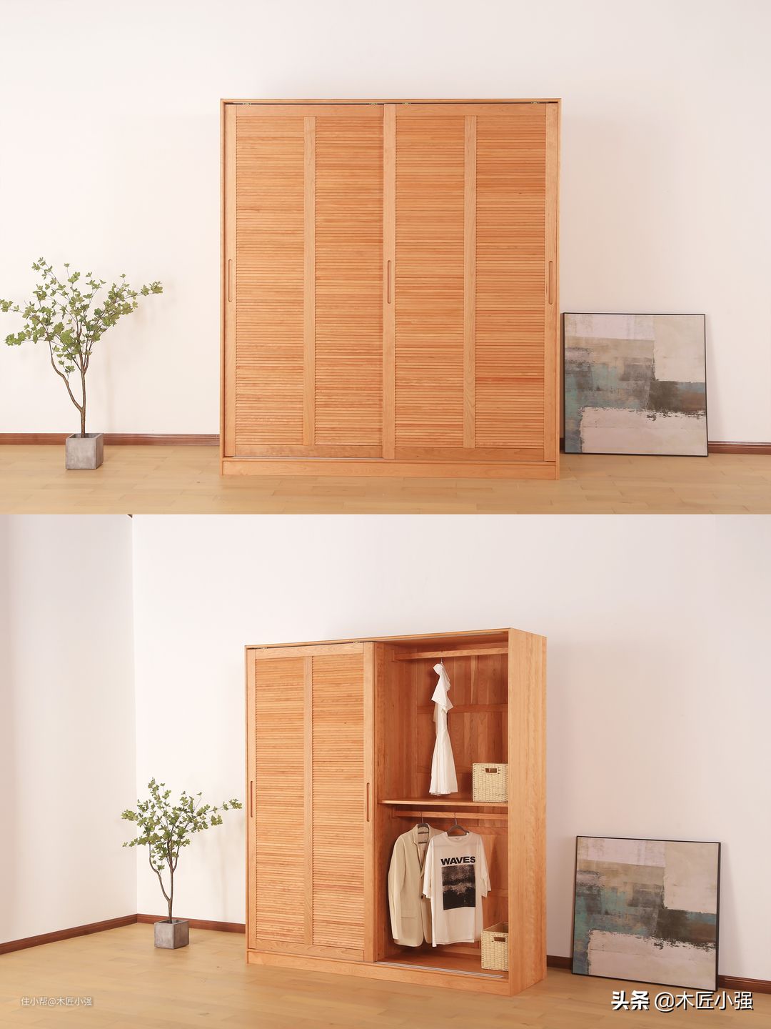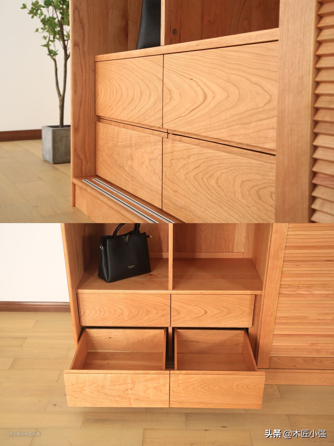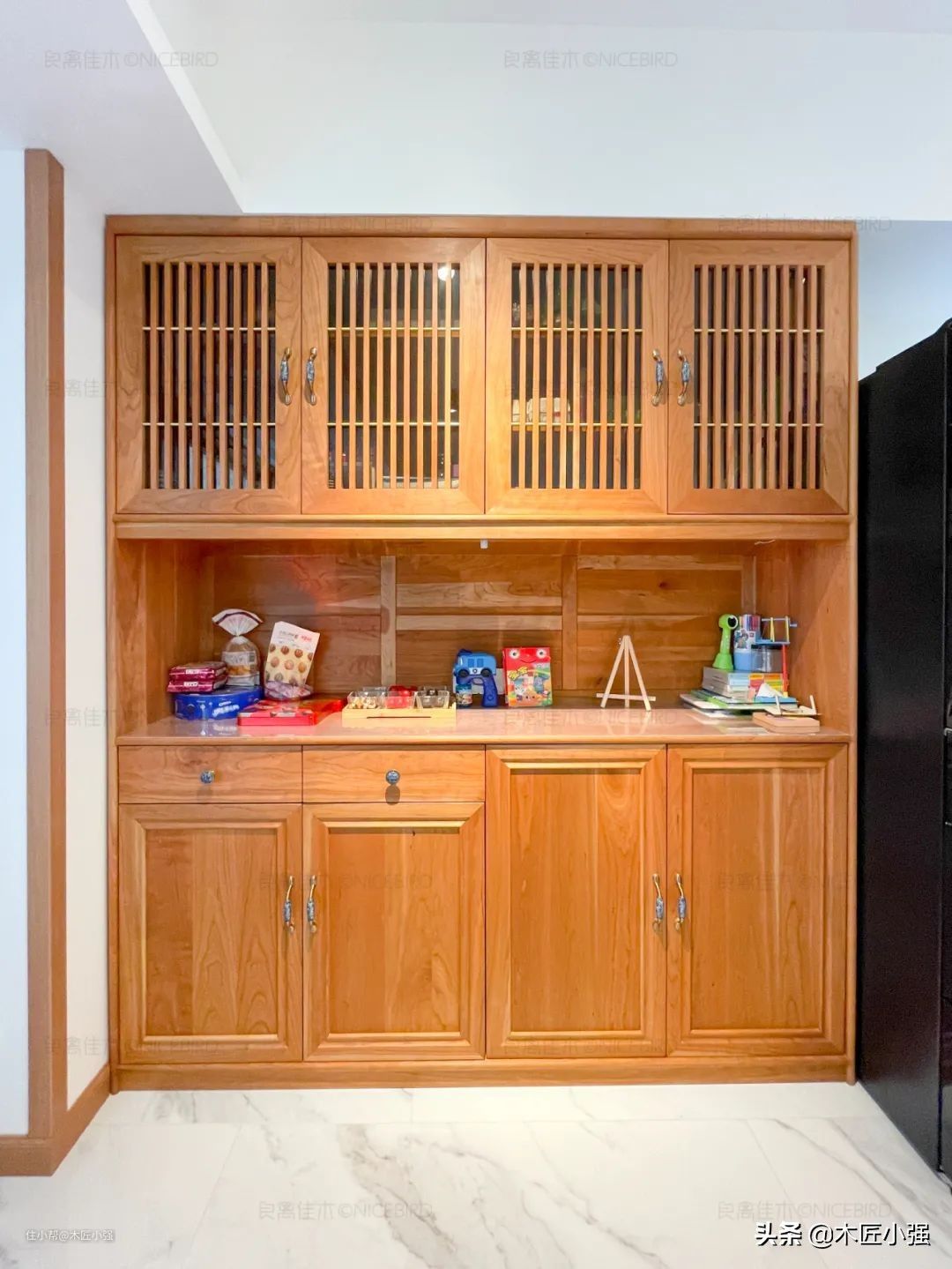 而对于衣柜这种柜门面积较大的,若是不喜欢有可能出现的色差问题,你可以格栅门的。格栅处理能很好地解决色差的问题,最起码会让色差不太明显,即便有也无伤大雅,给喜欢樱桃木的宝宝参考哒