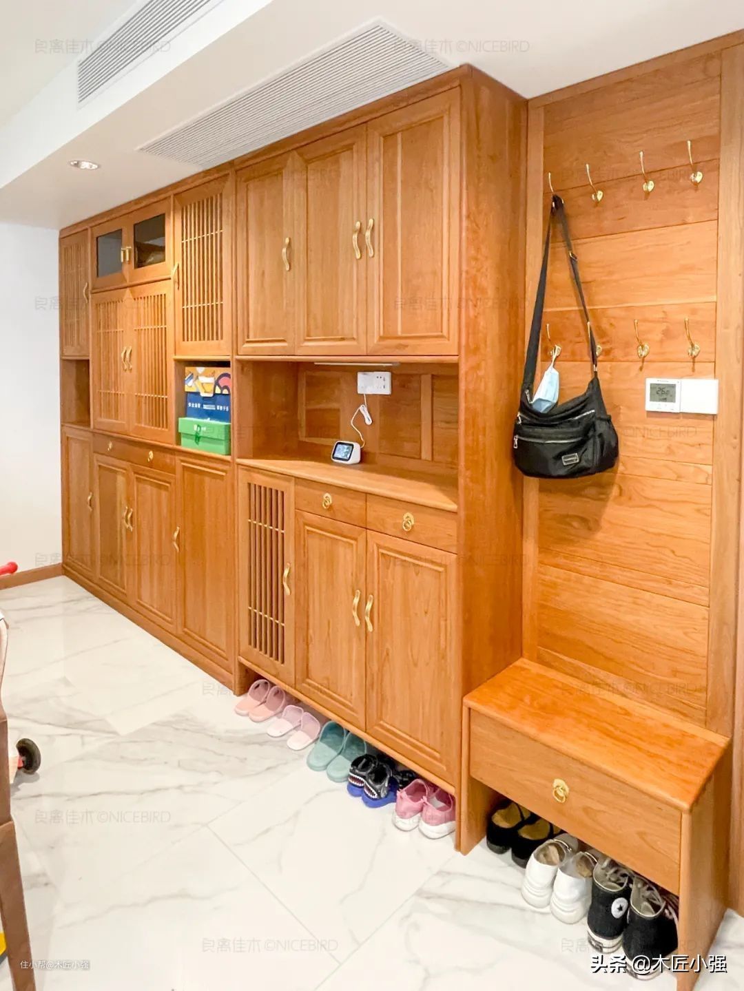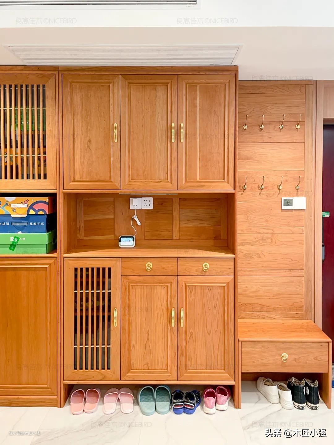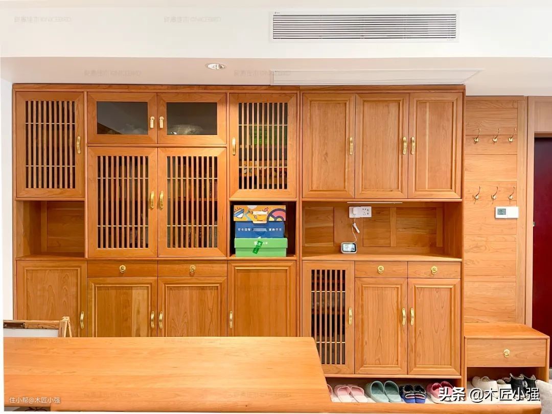 比如下面这个有点新中式的樱桃木玄关柜,刚生产出来时颜色是偏黄粉色的