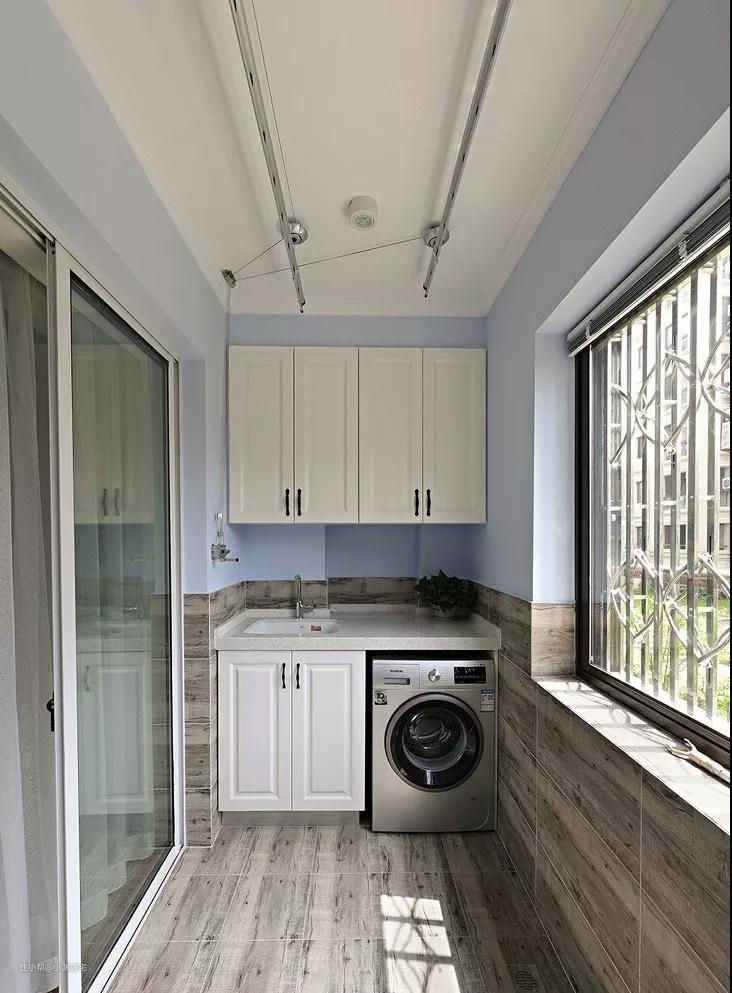 阳光这种“干衣机”有一个缺陷,就是位置是固定的,不能想装在哪就装在哪。所以我们的洗衣房,就只能放在阳台上了。这样一来,把洗衣机也摆在阳台上,洗完衣服直接晾干,流程和国外的洗衣房就是一样的。