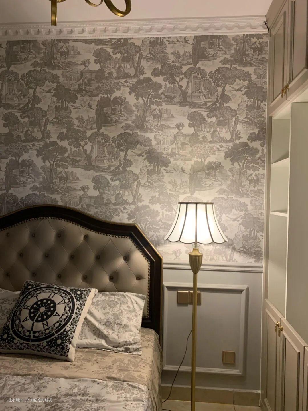 第二间卧室的定制衣柜直接上顶,可以提供更多的储物空间。墙面贴了壁纸,很大气,质感很好。一张美-style双人床,搭配一张四合一的床,睡起来特别舒服。除了盖住中央空调,其他地方只拍了一圈石膏线条,不会那么压抑。