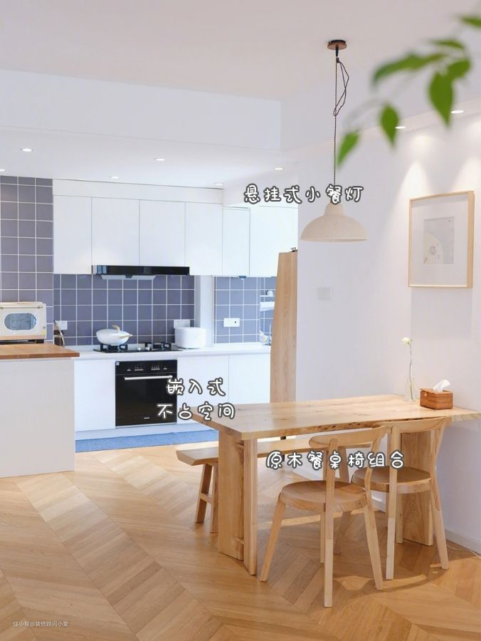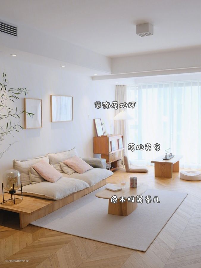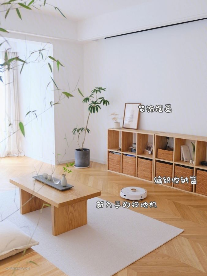 欣赏一下朋友家的布置,用的就是浅色带纹理的地板,其实浅灰色的耐脏效果会更好,但是她觉得颜色太冷,没有家的温馨感,她想要的是那种日式原木风,一切从简设计。