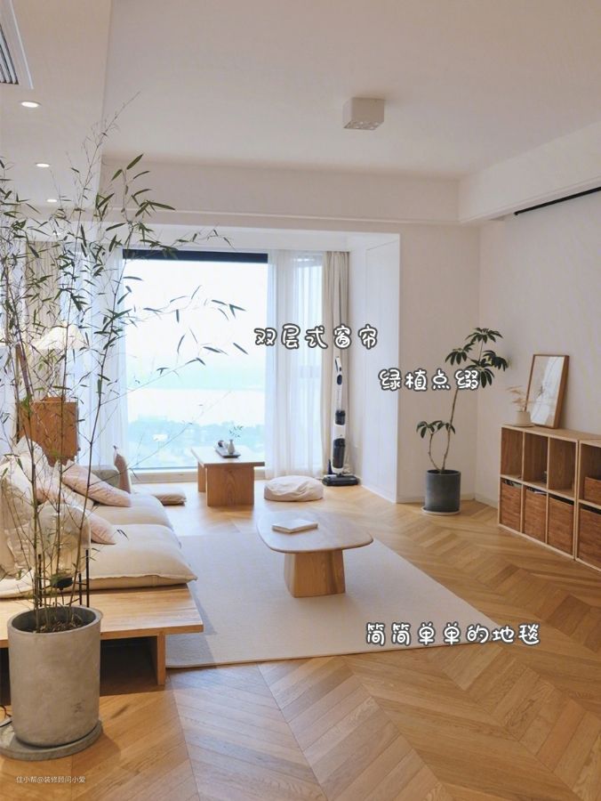 浅色的木纹地板,搭配深浅不一的原木色家具,都很“耐脏”。米色的坐垫、地毯和绿植作为点缀色,让空间不单调。