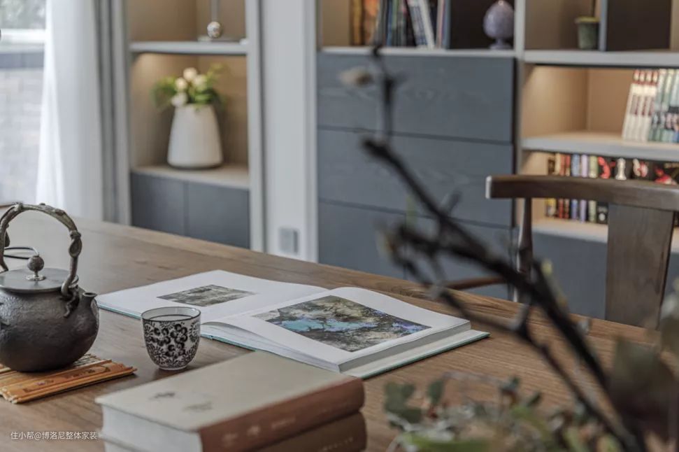 三号选手是书房,亦可作茶室。诗中有茶香,茶中有人间清欢。业主将心爱的茶具珍藏柜中,香茶需好器,好器衬香茶。雅致的灰调在地面微妙光泽与精巧墙面装饰的映衬下,平添了温暖的和煦气韵。
