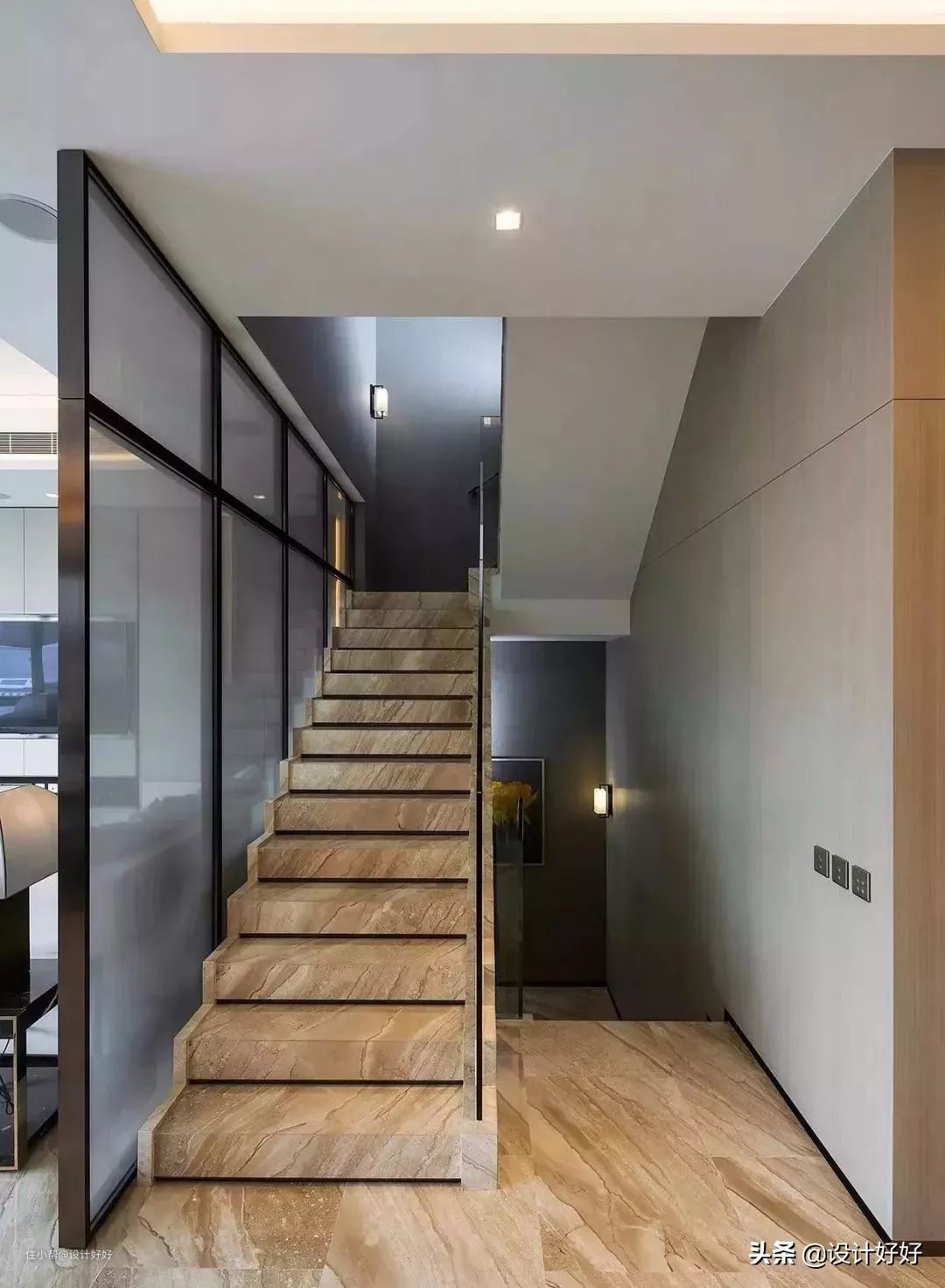 2、L型楼梯:楼梯呈L型布置,对于一些长度不足的空间,无法修建直梯,可以做L型楼梯。优点是占用空间长度比较短,同时可以获得不错的楼梯坡度,缺点是占用空间较宽一些。