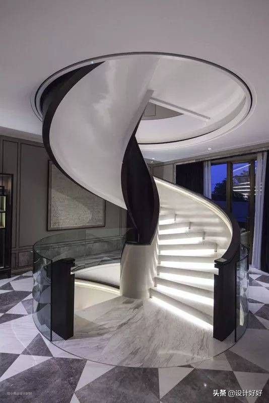 5、弧形楼梯:可做成椭圆,或者其它弧线型;弧线楼梯外型比较美观,可以美化空间,但是占用空间比较多,适合空间充裕的空间。或者爬升高度比较低的场景。