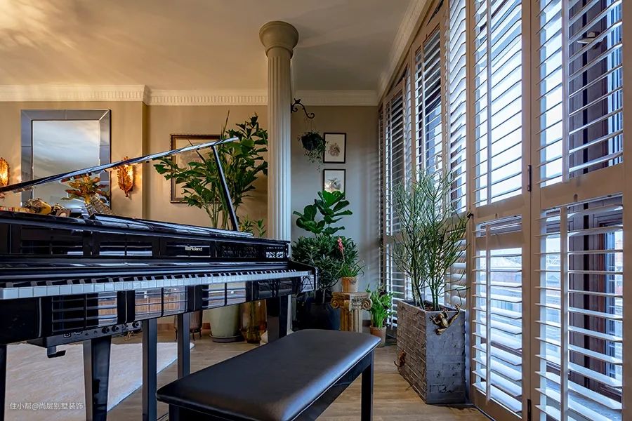 后期在家具陈设上,设计师也是别出心裁,打破常规的做法,以窗边洒落进的阳光作为基准线,大客厅的两大功能区会客区和正餐区,都可以经由窗边随意进入,不设固定的动线安排。换句话说,会客区和正餐区的动线是呈放射状的,使人进出自由,达到休闲放松的效果。业主还酷爱弹钢琴,设计师便将钢琴区设立在会客区靠近窗边的位置,这样不管夏先生什么时候想弹琴,他都能享受阳光洒落在琴键上,两手上下触动,聆听那些世界经典名曲,细细品味慢时光带来的轻松与惬意。